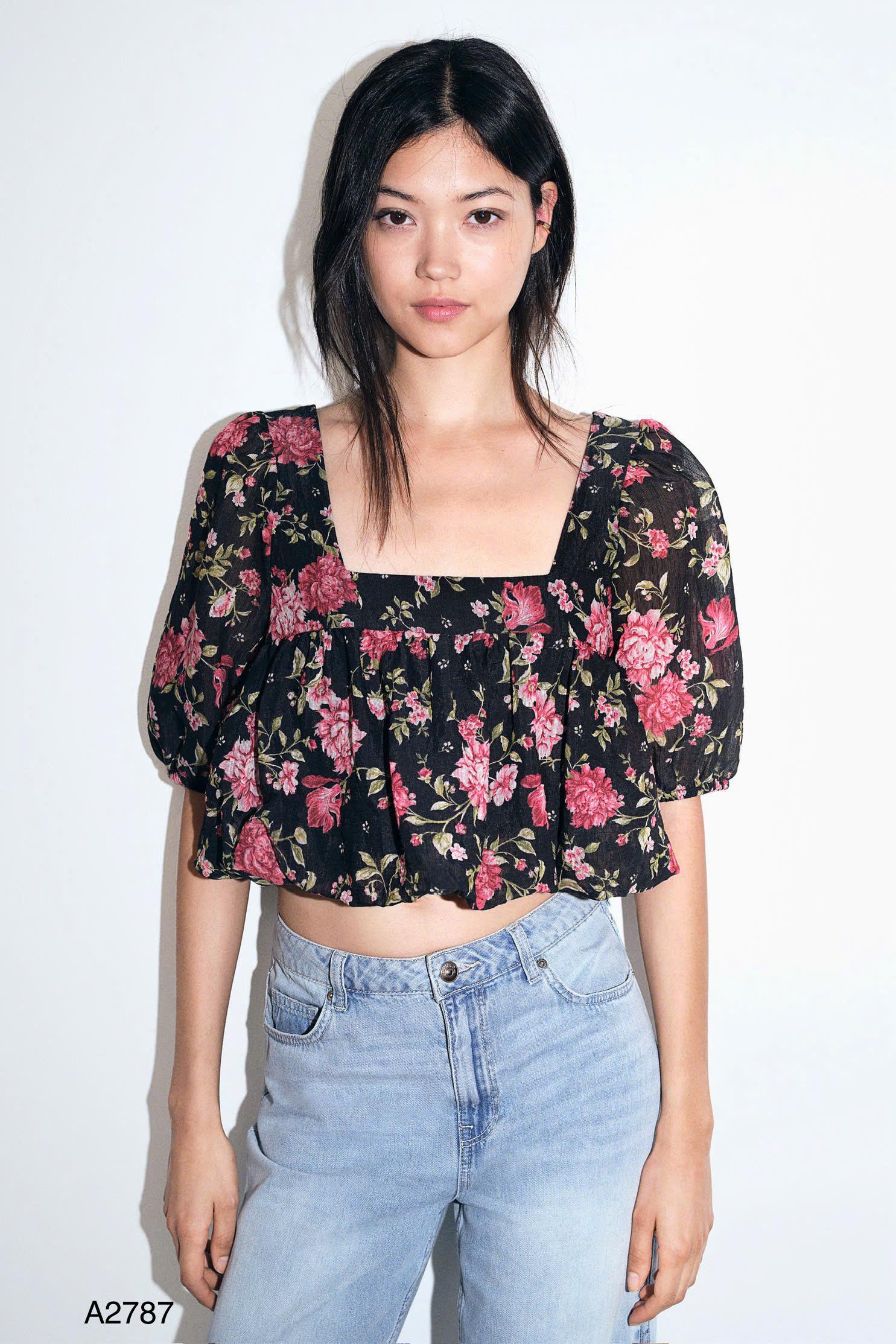 CRT CỔ VUÔNG TAY BỒNG ĐEN HOA HỒNG